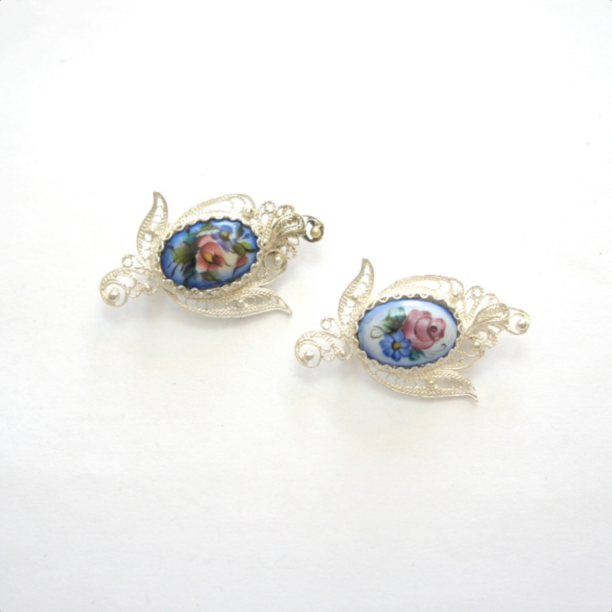 Брошь 4х3 см, оправа скань, вставка финифть, посеребрение.