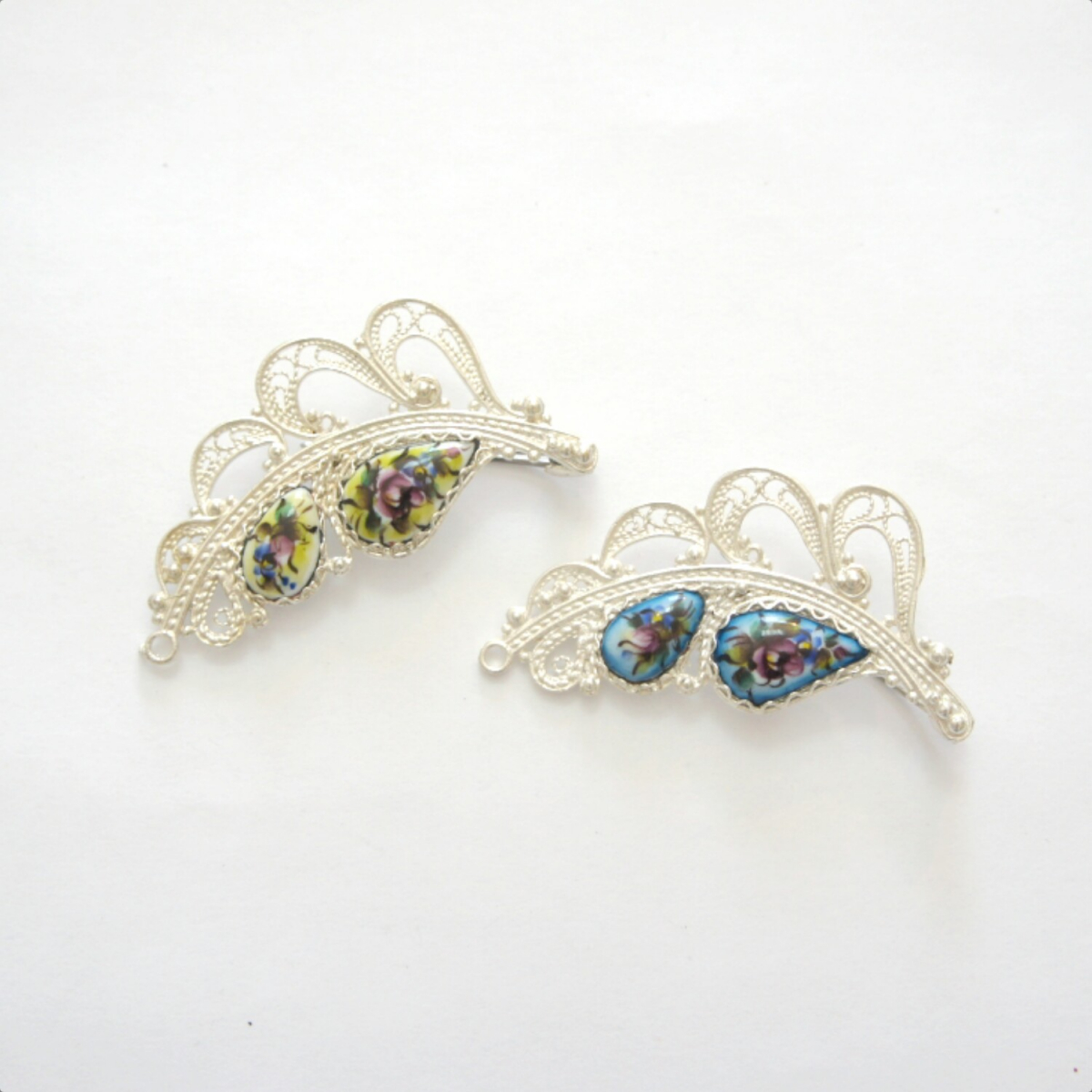 Брошь 6х3 см, оправа скань, вставка финифть, посеребрение.