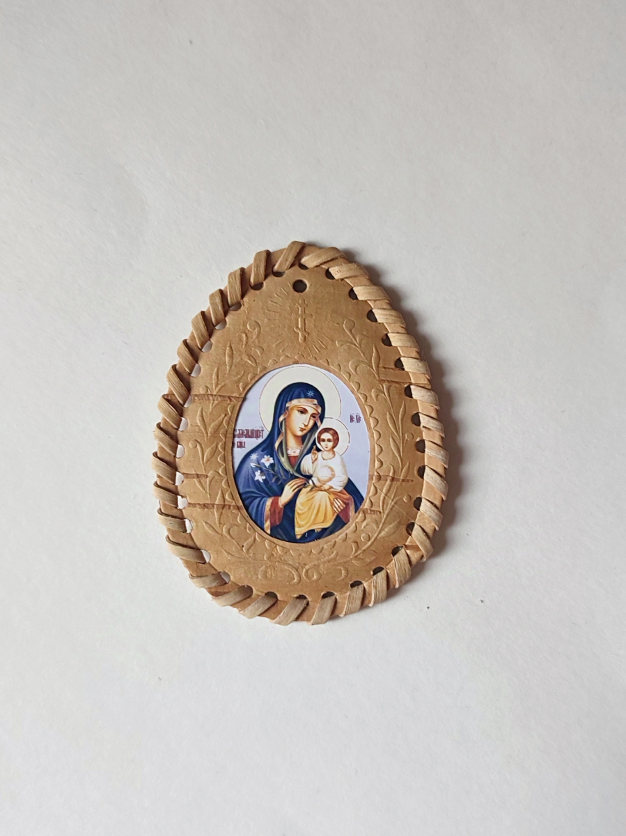 Икона в бересте для ношения с собой. На иконе изображено Икона Божией Матери «Неувядаемый Цвет»