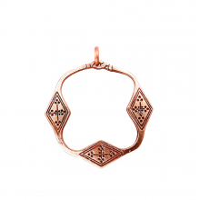 Узор на подвеске – ромбы с точками – символ плодородного поля. Он говорит о том, что его хозяйка – взрослая женщина. Вместе с тем внутри ромбов есть ещё и солнечные кресты, каждый конец которых венчается тремя точками: восходом, зенитом и закатом – «тресветлым солнышком». Всё вместе говорит о солнечной защите и пожелании плодородия хозяйке украшения.