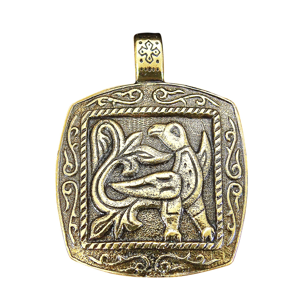 Подвеска с мирной птицей – символом души. Поднятое крыло – на творческий полёт, процветший хвост – пожелание процветания, по бокам подвески изображены молодые побеги – на удачу в начинаниях.