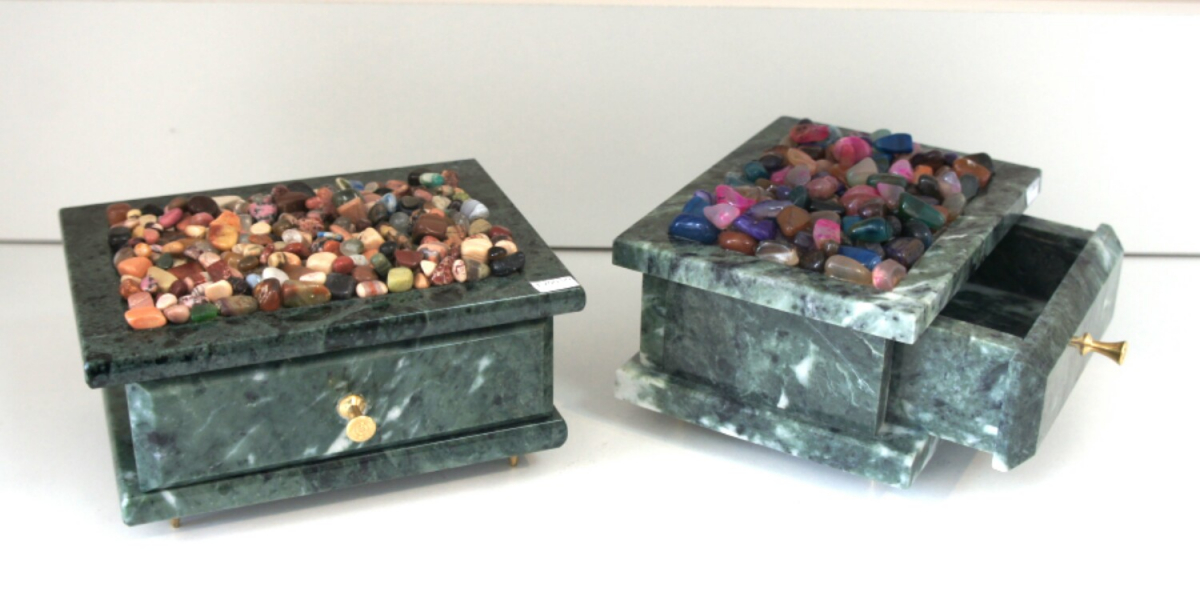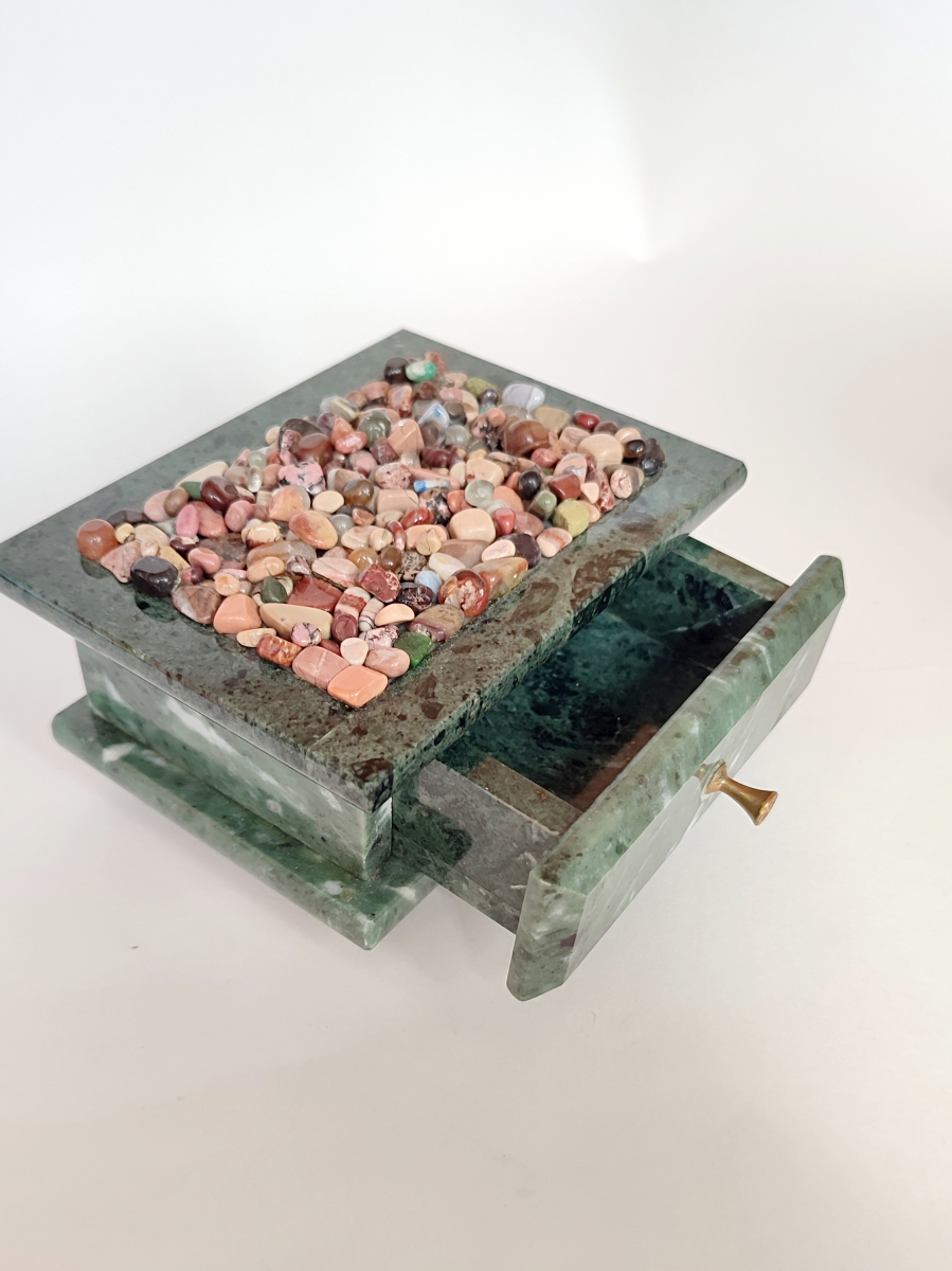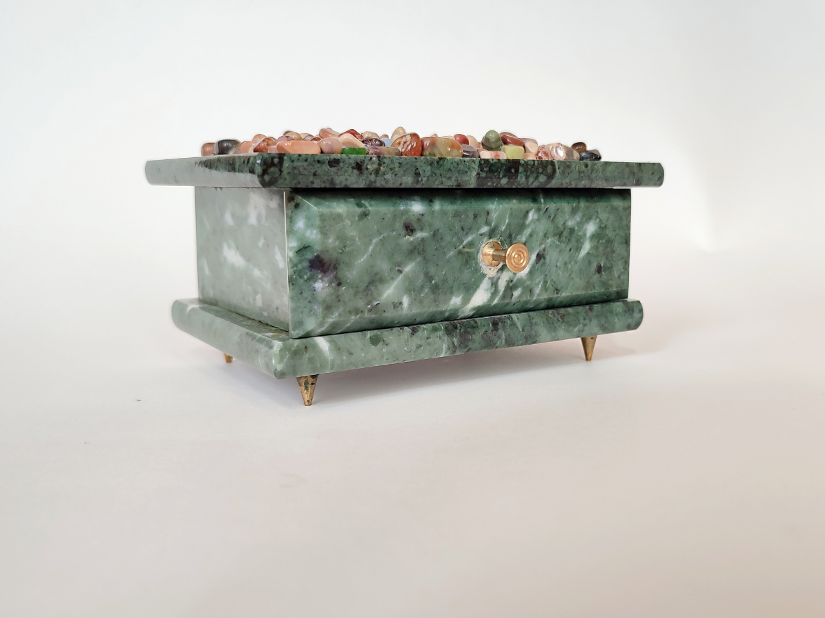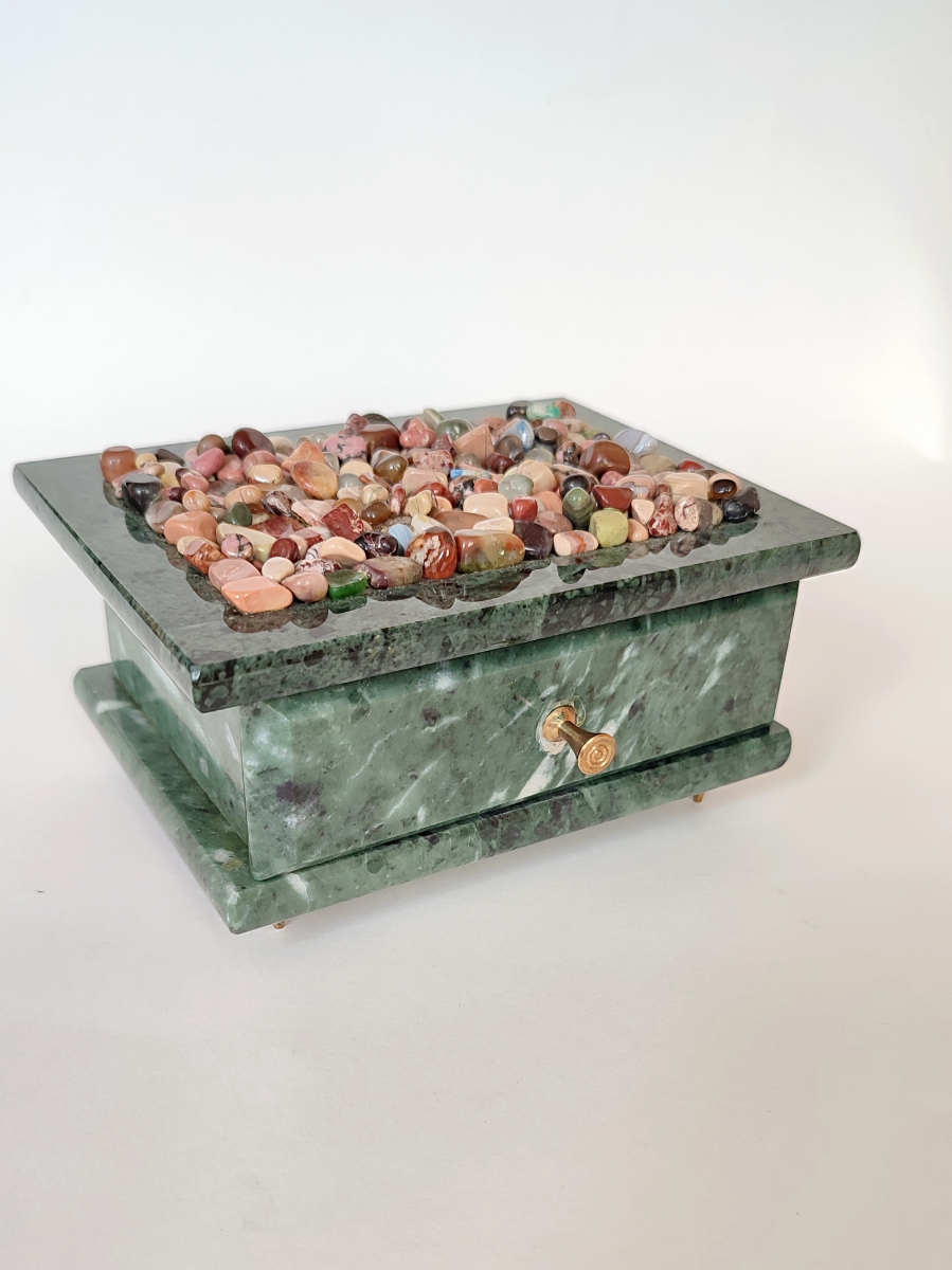 Шкатулка с выдвижным ящиком из камня змеевик с мелкой галтовкой из разных камней.